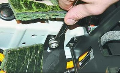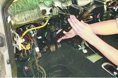 8. Отверните две гайки нижнего крепления кронштейна педального узла к щиту передка...