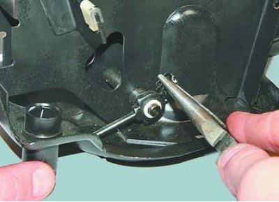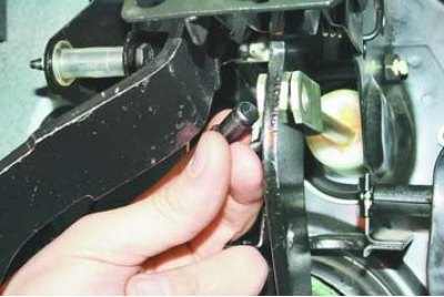 23. ...снимите фиксатор ее оси, извлеките ось из отверстий кронштейна и педали и снимите педаль.