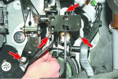 4. Отверните три гайки, которыми одновременно прикреплены к щиту передка вакуумный усилитель тормозов и кронштейн педального узла, одну гайку левого бокового крепления кронштейна...