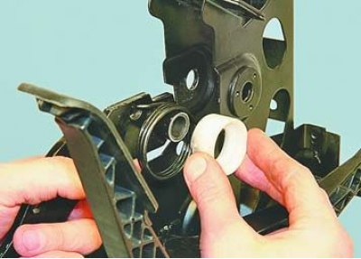 24. При необходимости замены пластмассовых втулок педалей выпрессуйте их из проушин педалей оправкой подходящего диаметра (например, головкой из набора инструментов). Запрессуйте новые втулки в обратном порядке.