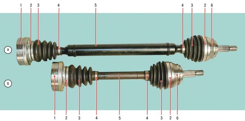 Рис. 6.7. Приводы передних колес: а – привод правого переднего колеса; б – привод левого переднего колеса; 1 – внутренние шарниры равных угловых скоростей; 2 – большие хомуты крепления чехлов шарниров; 3 – чехлы шарниров; 4 – малые хомуты крепления чехлов шарниров; 5 – валы приводов; 6 – наружные шарниры равных угловых скоростей