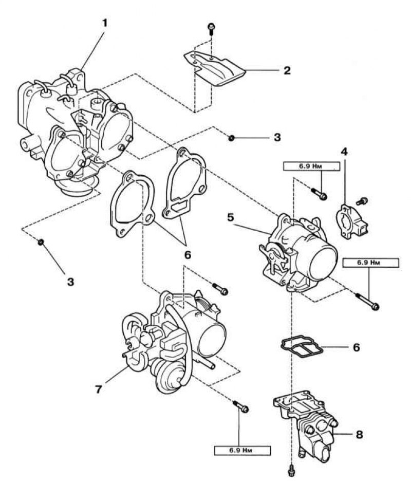 6. При установке используйте новую прокладку между корпусом дросселя и воздухораспределителем. Затягивайте крепёж с требуемыми усилиями.