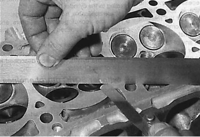 Используя металлическую линейку и щуп, проверьте плоскостность сопрягаемой поверхности головки блока цилиндров. При неплоскостности более чем 0,1 мм необходимо перешлифовать головку, при этом высота ее должна соответствовать требованиям.