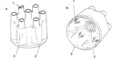 А 1. Обломанный край; 2. Следы от искр; 3. Трещина в крышке распределителя зажигания
