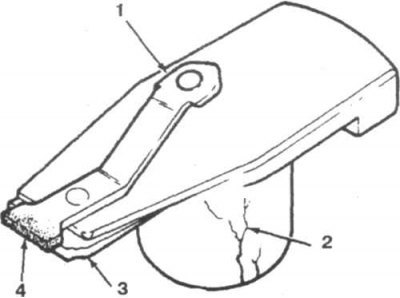 28.11 Проверьте бегунок распределителя зажигания на наличие следов износа или коррозии: 1. Недостаточная жесткость пружины; 2. Трещины; 3. Следы трения о крышку; 4. Коррозия на кончике бегунка