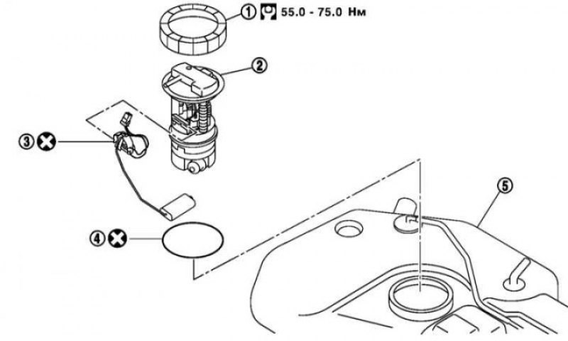 1 - Стопорное кольцо; 2 - Сборка; 3 - Блок датчика запаса топлива; 4 - Уплотнительное кольцо; 5 - Топливный бак