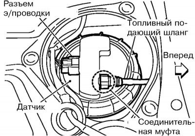 4. Отсоедините от датчика запаса топлива электропроводку и топливный подающий шланг. Наденьте на открытые концы топливных линий полиэтиленовые пакеты.