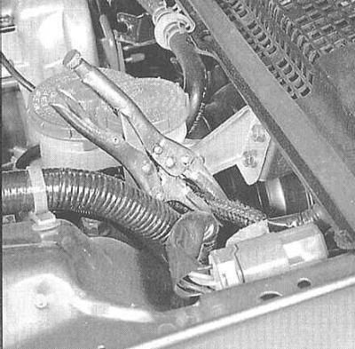 3. Струбциной пережмите подающий шланг, соединяющий резервуар с главным цилиндром.