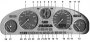 Панели приборов (автомобили с бензиновым двигателем) 1. Электронный тахометр; 2. Сигнализатор падения давления масла в двигателе; 3. Индикатор включения левого указателя поворотов; 4. Центральный сигнализатор неисправности (STOP); 5. Индикатор включения правого указателя поворотов; 6. Сигнализатор...