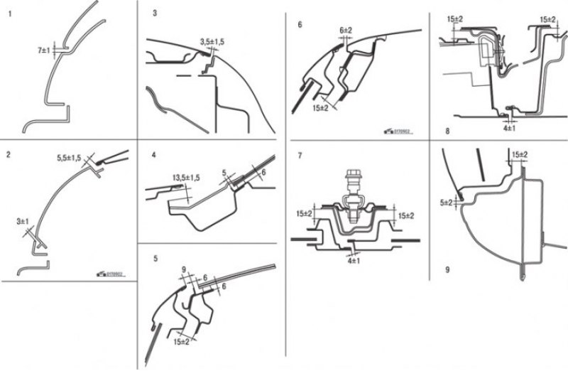 На рис. 9.1 показаны зоны автомобиля, для которых установлены контролируемые зазоры между кузовом и его съемными элементами, а на рис. 9.2а