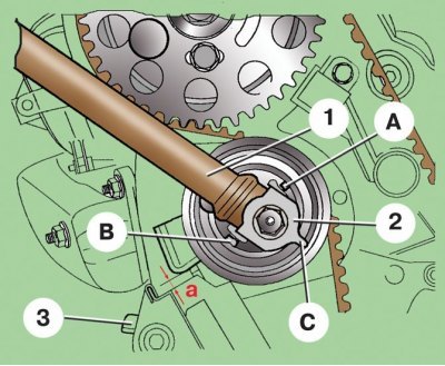 18. С помощью специального ключа 1 (см. рис. Натяжение ремня привода распределительного вала) поверните эксцентрик 2 натяжного ролика по часовой стрелке так, чтобы его выступ С дошел до упора В.
