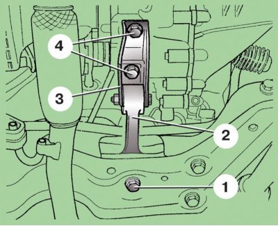 1 – болт крепления опоры к кузову; 2 – опора; 3 – кронштейн опоры; 4 – болт крепления опоры к коробке передач