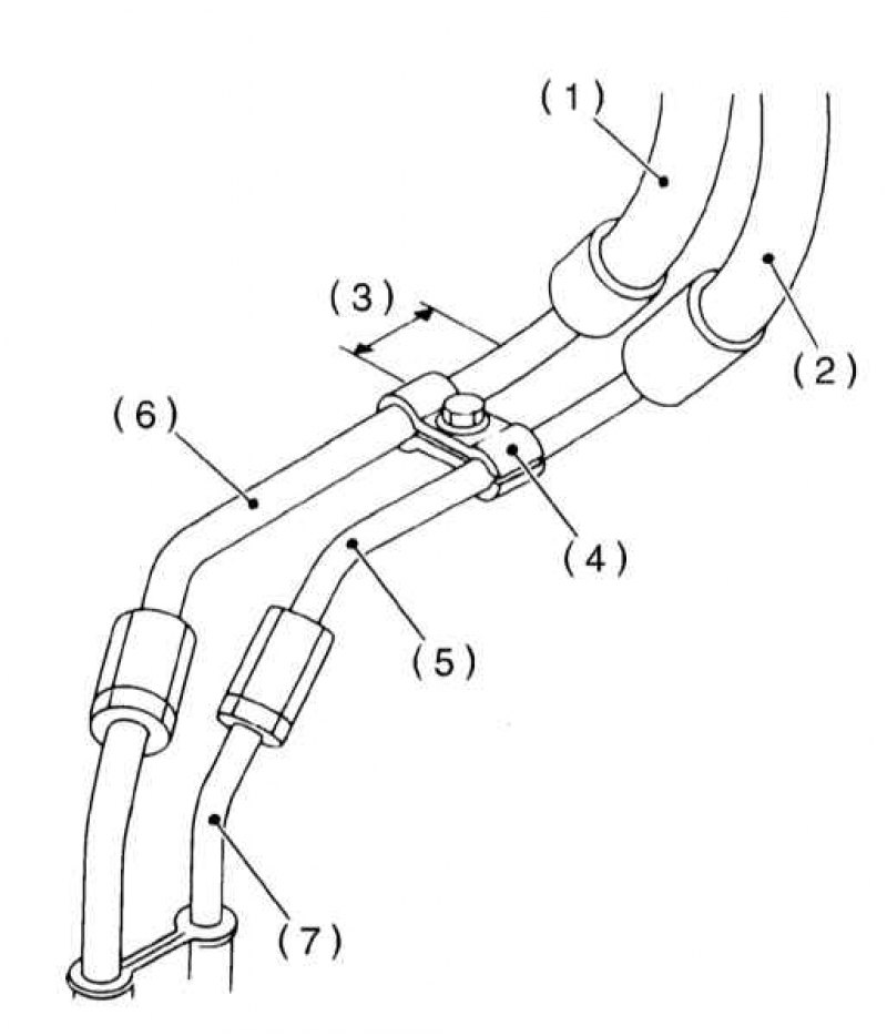 1 - Возвратный шланг; 2 - Напорный шланг; 3 - Приблизительно 30 мм; 4 - Хомут Е; 5 - Трубка C; 6 - Трубка D; 7 - Трубка со стороны рулевого механизма