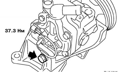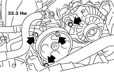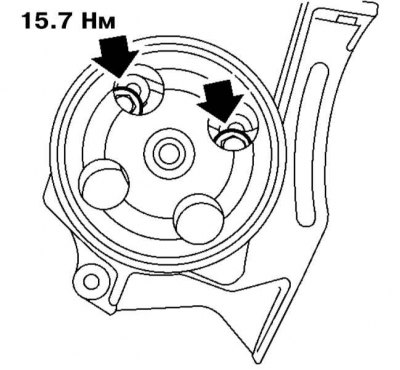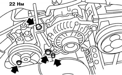 5. Установите сборку насоса с кронштейном на свое штатное место на двигатель, вверните и затяните с требуемым усилием (22 Нм) крепежные болты.