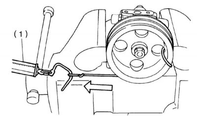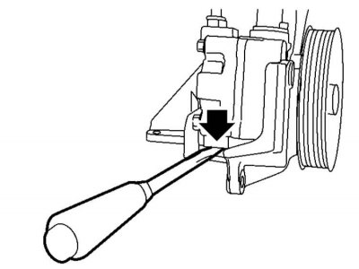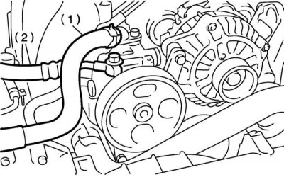 1. Отпустите стопорный и регулировочный болты и снимите V-образный ремень привода рулевого насоса.