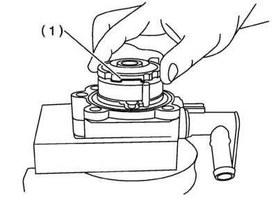 1. Зажмите опорный кронштейн насосной сборки в тиски с мягкими губками и при помощи полудюймовых торцевых головок на 14 и на 21 мм плотно притяните втулку к корпусу насоса.