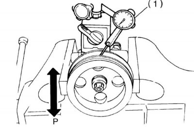 1. Руководствуясь схемой, приведенной на сопр. иллюстрации, несильно зажмите насосную сборку в тиски с мягкими губками (лучше будет проложить между губками тисков и корпусом насоса пару деревянных блоков) и при помощи циферблатного измерителя плунжерного типа оцените величину бокового люфта вала насоса при прикладывании к шкиву усилия в 1 кГс. Если результат измерения составляет более 0.4 мм, замените насосную сборку.